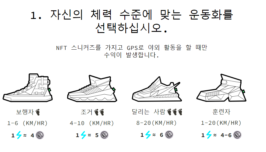 스테픈의 신발은 보행자, 조거, 러너, 트레이너 등급으로 분류가 되었으며, 구분은 달리는 속도에 따라서 채굴량이 달라지는 차이가 있습니다. 즉, 내가 빨리 달려서 채굴량을 늘리겠다 하시는 분은 러너를 하시면 되고, 나는 그냥 걸어서 채굴을 하겠다 하시는 분은 보행자를 선택해서 구매하시면 됩니다.