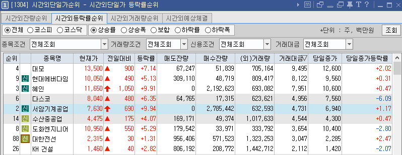 시간외단일가 순위 거래대금 순위로 보면 대모, 현대에버다임, 혜인, 다스코, 서암기계공업 등이 있습니다.