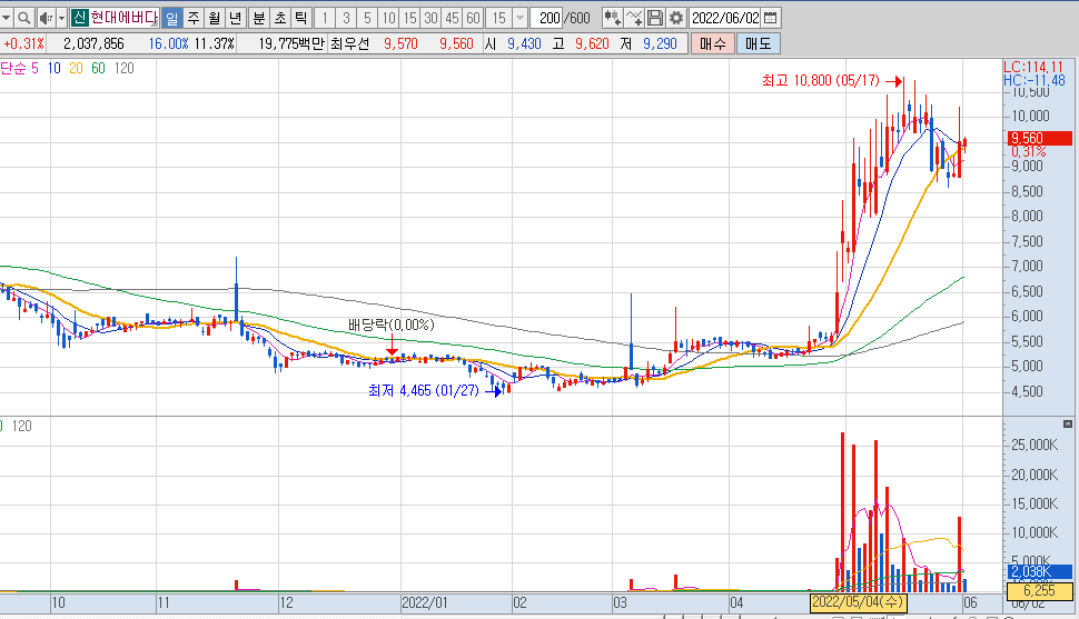 현대에버다임의 일봉 차트를 보시면 거래대금과 함께 상승을 보여주였으며, 전고점 10,800원을 어떻게 뚫어주냐 봐야 할 거 같습니다.