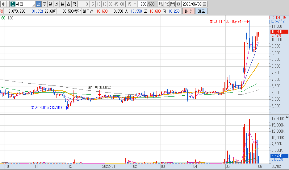 혜인은 시간외에 상한가로 마감하였으며, 상한가 가격은 11,650원으로서 이미 전고가를 돌파한 모습입니다. 내일 거래대금과 함께 상승을 하면 좋은 모습을 보여줄 수 있을 거 같습니다.