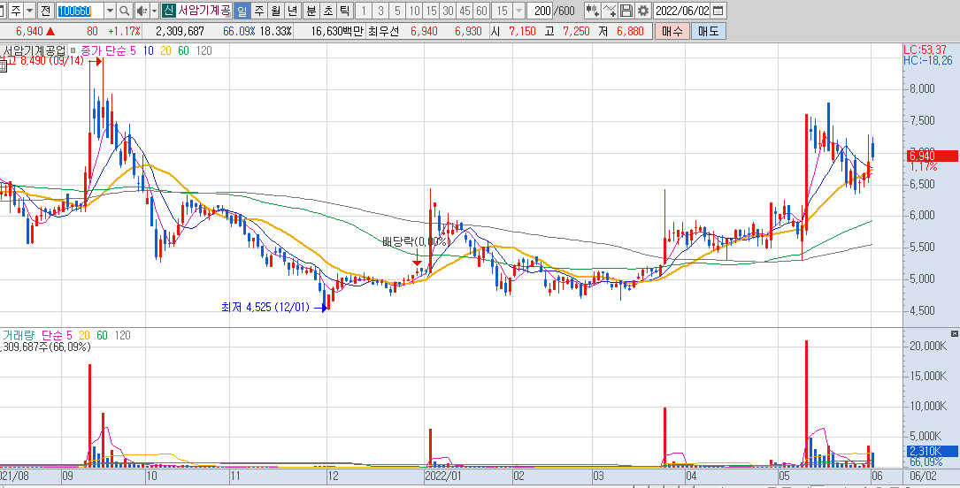서암기계공업 일봉차트를 보면 장대양봉 후 N자 상승을 준비하고 있으며, 저항대는 전고점인 8,500원 부근입니다.