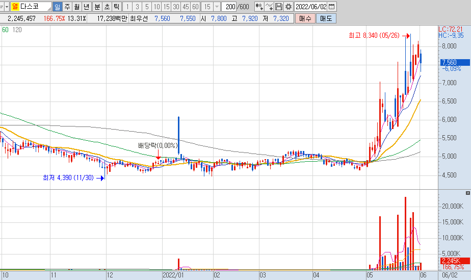 다스코의 일봉 차트 또한 거래대금과 함께 상승을 하였고 시간 외 가격은 8,040원으로서 전고가를 돌파하지 못한 모습을 보여주고 있습니다.