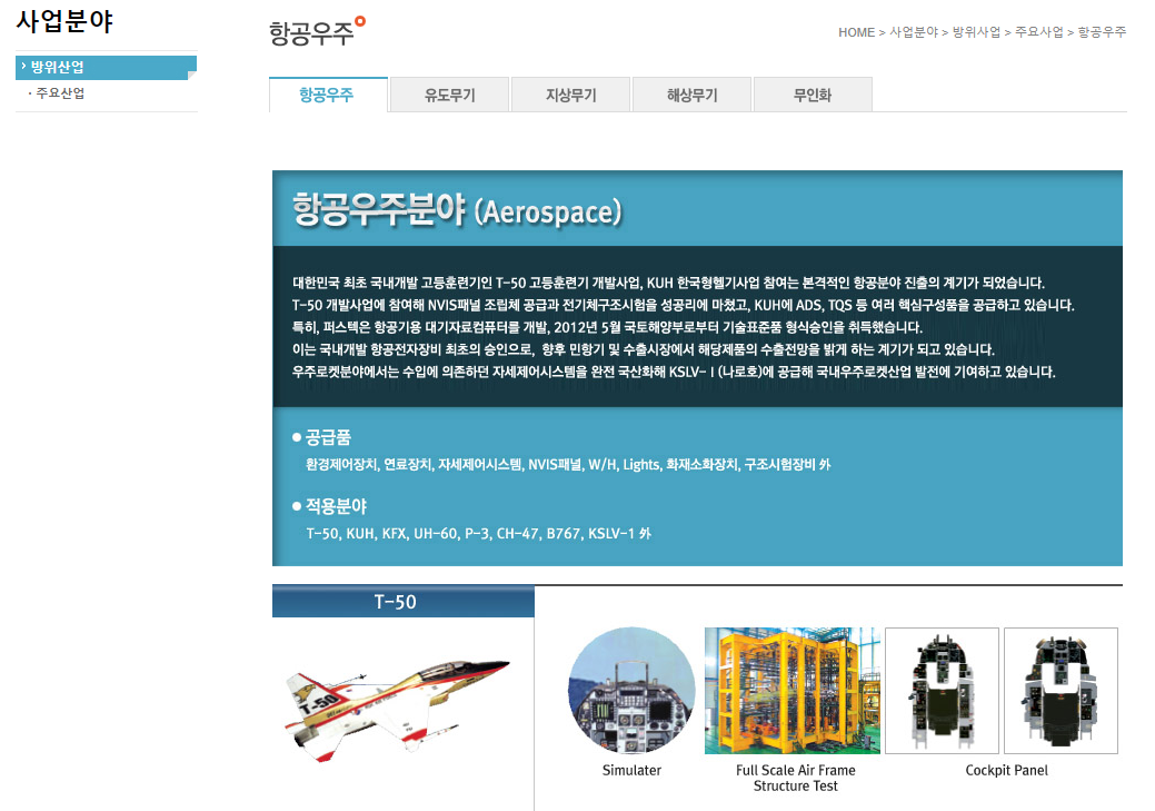.퍼스텍은 국내에 단일 사업 부분(방위사업)을 운영하고 있으며, 국가 방위사업체로 지정된 이후 T-50, 수리온, 단거리 지대지, 지대공 유도무기, K-9 자주포, K-10 탄약운반차 등 굵직한 체계사업에 참여하고 있습니다. 다양한 분야에서 발사통제장비, 구동장치, 냉각장치, 자동소화장치 등을 개발 및 생산하며, 퍼스텍의 기술 및 품질을 인정받고 있는 회사입니다.