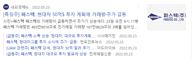 퍼스텍은 5월22일 정의선 현대자동차 그룹 회장이 발표한 도심 항공 모빌리티(UAM) 투자 계획에 기대가 모인 것으로 보였으며, 퍼스텍은 국토교통부가 UAM 상용화 서비스 운용전략을 위해 주관한 'UAM 팀 코리아' 사업에 초청기관으로 참여한 이력이 있어서 UAM 관련주로 거론되고 있습니다.
