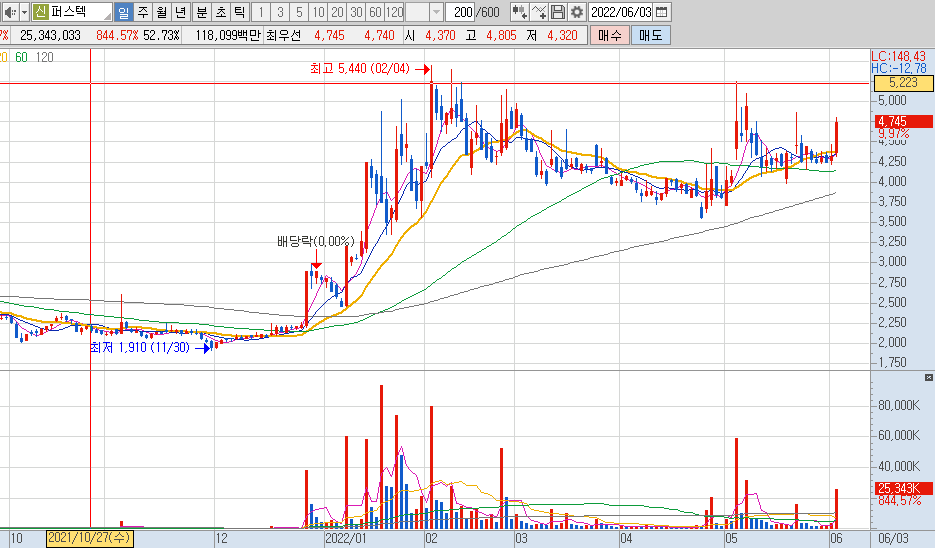 퍼스텍 일봉 차트를 보시면 전고점을 돌파하려는 모습의 상승세를 보이고 있습니다. 특히 시간외에서 5,200원까지 상승을 하여서 전고점에 다다른 모습이지만, 다음 주 화요일 오전에 어느 정도 거래대금이 나오는지 확인할 필요가 있습니다. 아무래도 퍼스텍은 방산 관련주의 성향이 강하므로 방산 관련 이슈에 대해서 체크할 필요가 있으며, 실제로 시간외에 퍼스텍을 필두로 방산 관련주들이 일제히 상승한 모습을 보여주었습니다.