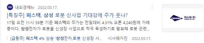 퍼스텍은 삼성전자 로봇, 우크라이나 전쟁 , 도심항공모빌리티, 드론 등 관련주로 엮여 있는 것으로 보이고 있습니다.