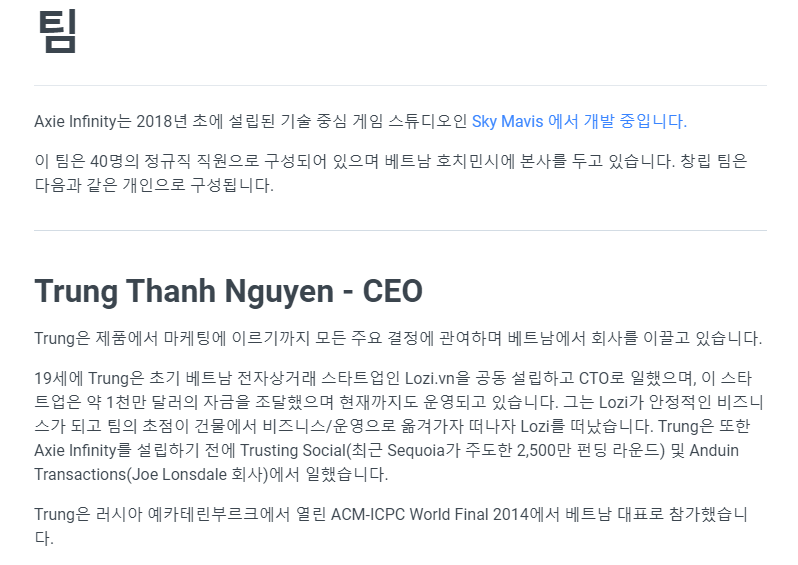 엑시인피니티 코인의 팀은 2018년 초에 게임스튜디오인 SKY MAVIS에서 개발하였으며 40명의 정규직 직원으로 구성되어 있습니다. 특히 베트남 호치민시에 본사를 두고 있으며, CEO는 19세이 초기 베트남 전자상거래 스타트업인 LOZI을 공동 설립하고 CTO로 일을 하였습니다. 즉, 베트남 팀의 프로젝트로서 P2E 중 가장 좋은 평가를 받고 있습니다.