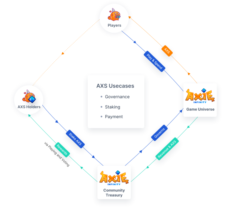엑시인피니티 코인은 ERC-20 거버넌스 토큰으로서 토큰을 스테이킹하고 거버넌스 투표에 참여하면 보상을 청구 할수 있는 시스템입니다. 또한 게임 플레이를 통해서 사용자 생성 콘텐츠 이니셔티브를 통해서 엑시인피니티 코인을 얻을 수 있습니다.