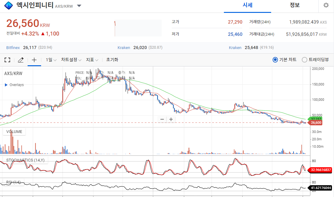 엑시인피니트는 약 200,000원까지 갔었던 암호화폐로서 P2E 코인 중 대장주였습니다. 하지만 코인 하락장과 더불어 현재 26,000원 부근에서 바닥을 다지고 있는 모습으로서 어느 정도 횡보 후에 상승세를 이어나가지 않을까 추측이 됩니다.