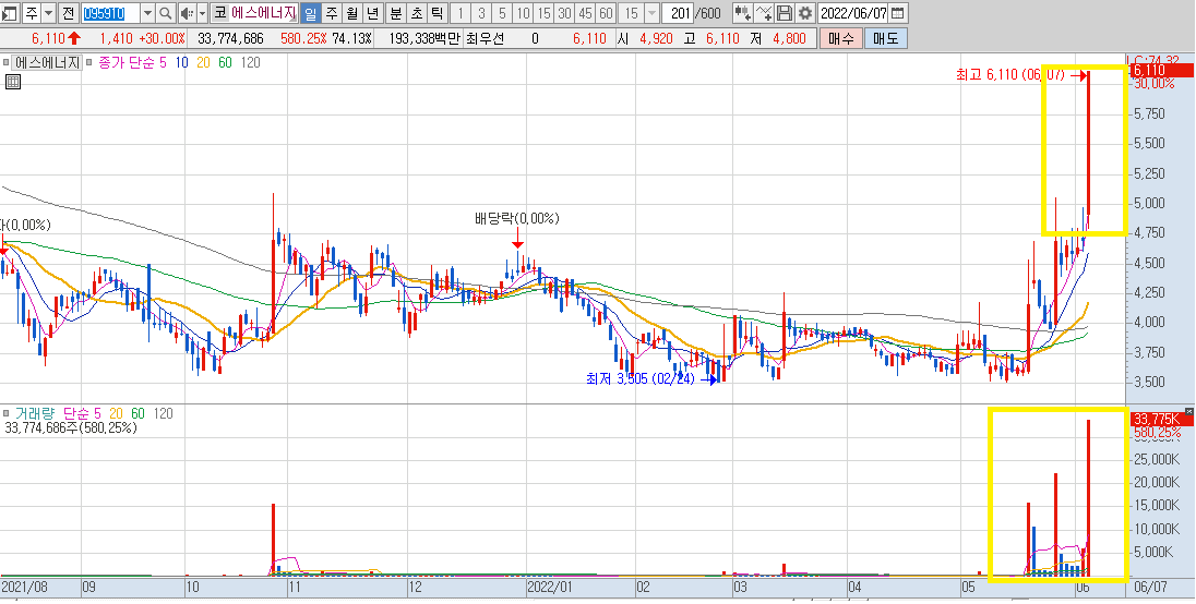 에스에너지 일봉차트를 보시면 최근 거래대금과 함께 상승세를 만들다가 상한가로 마감한 모습을 보여주고 있습니다. 기존 박스권을 거래대금과 함께 강하게 돌파한 모습으로서 상승추세를 만들어 갈것으로 예상이 됩니다.