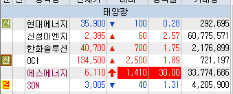 SDN, 신성이엔지, 한화솔루션, OCI 등 태양광 관련줄로 알려진 종목들은 오늘 큰 상승세를 보여주지 못하였지만, 에스에저니지는 오늘 시장을 주도하며 거래대금과 함께 상한가에 마감을 하였습니다. 그래서 에스에너지에 대해서 설명을 드리도록 하겠습니다.