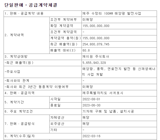 에스에너지는 제주특별자치도 서귀포시와 제주 수망링 100MW 태양광 발전산업 단일 판매 및 공급계약체결을 3월16일에 공시를 한바가 있습니다. 이는 제이원 주식회사로부터 최근 매출액 대비 60.8%에 해당하는 1,550억원에 달하는 공시입니다.