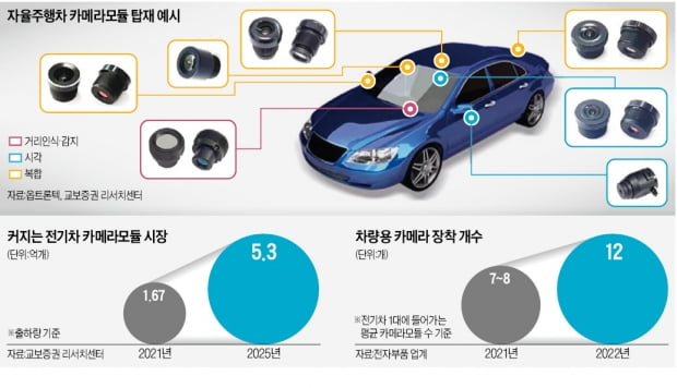 전기차 한 대당 들어가는 카메라 모듈 수는 2020년 2개에서 2021년 7~8개로 증가를 했고, 올해는 12개까지 늘어났습니다.