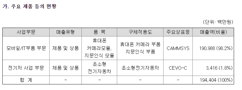 캠시스의 주요 제품 등의 현황을 보면 카메라모듈은 모바일 쪽에 납품하고 있으며, 초소형 전기자동차는 비율이 1.8%로 미비한 것으로 보아서 삼성전기 테슬라 수주와는 무관한 것으로 보이고 있습니다.