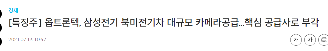 또한 옵트론텍은 이미 작년에 삼성전기 북미 전기차 대규모 카메라 공급사로서 부각이 된 적이 있어서 삼성전기와 연관이 있는 것으로 보이고 있습니다.