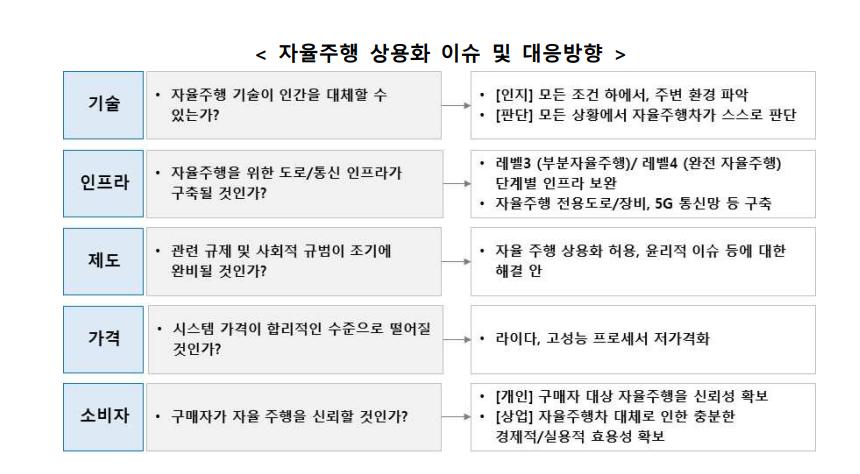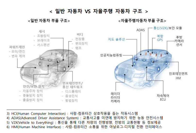 - 한국은 여전히 핵심 센서 등 중요 부품에 대한 기술확보가 더딘 상황이며, 인공지능 등 소프트웨어 경쟁력 확보도 시급합니다 ㅠㅠ