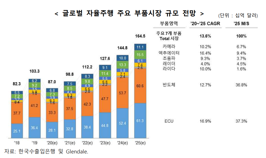 자율주행 자동차 보급 확대로 관련 부품시장 규모도 커지고 있으며, 2019년 1,033억 달러에서 2025년 1,645억 달러 규모로 성장할 것으로 예상합니다!!
