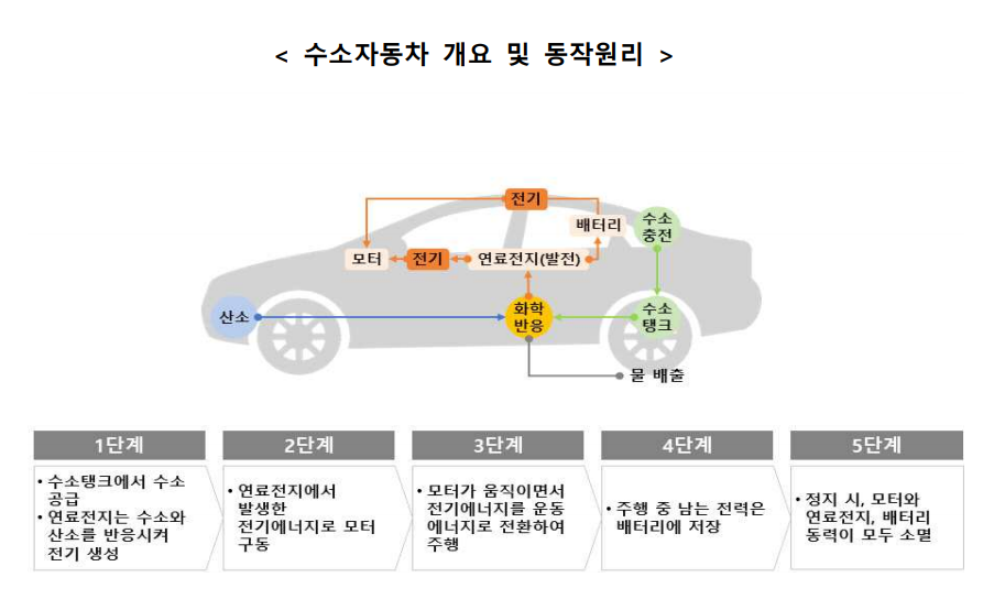 수소자동차는 전기로 구동되는 원리는 전기자동차와 같으나, 전기자동차와 달리 수소를 주입해 전기를 생산하고 생산된 전기를 이용해 주행한다는 점이 상이
