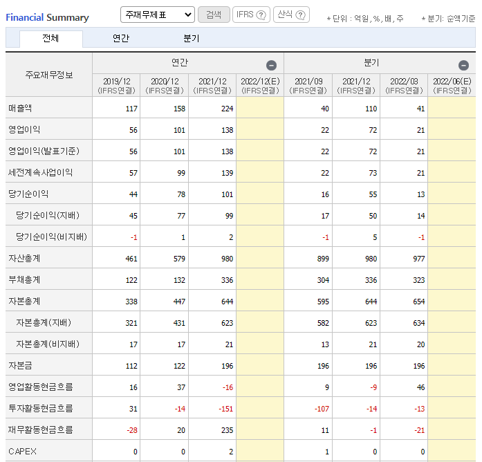 TS인베스트먼트 재무제표를 보면 꾸준하게 우상향 하는 모습을 보여주고 있으며, 2021년 기준 매출액이 224억 원 영업이익이 138억 원으로 호실적을 보여주고 있는 종목입니다.