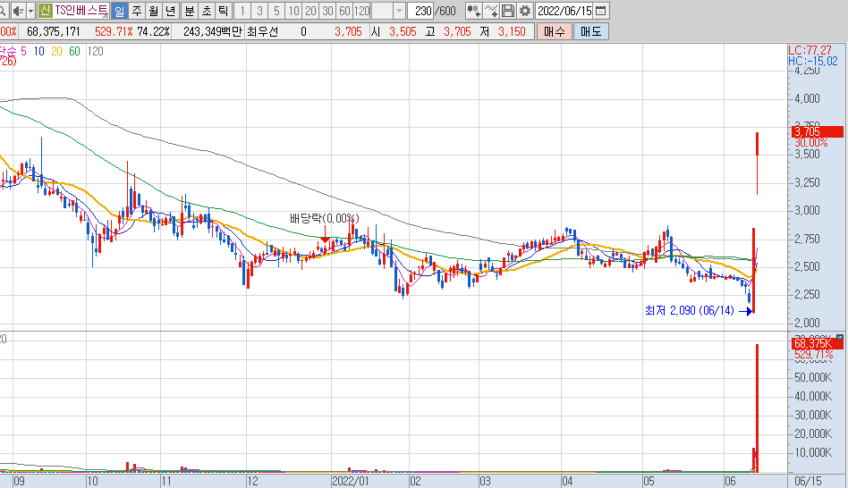 TS인베스트먼트 일봉차트를 보시면 그동안 바닥권을 다지고 거래대금과 함께 상한가로 마감을 하였습니다. 위에 매물대가 많으므로 신규 진입은 피하는 게 좋을 거 같습니다.