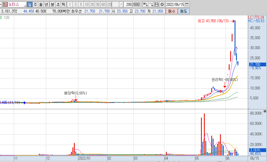 노터스도 무상증자 소식으로 상한가를 시작으로 6연속 상한가를 가고 지금은 하락세를 보여주고 있는 상황입니다.
