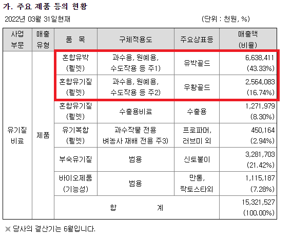 혼합유박비료를 펠렛화한 제품으로 질소, 인산, 가리 7% 이상, 유기물 70% 이상, 수분 15% 이하로 적은 양을 시바 하여도 효과가 우수하고 경제적인 제품으로 제품명은 '유박골드'로 과수용, 원예용, 수도작용 등 전 부분에 걸쳐 사용되고 있습니다.