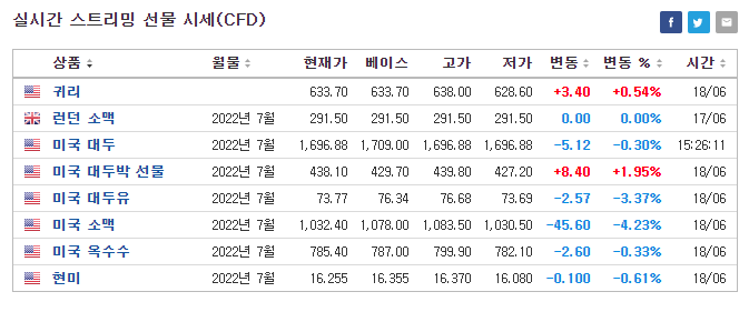 실시간 곡물 가격 시세를 보면 변동폭이 하락 추세로 이어지면서 어느 정도 조정을 받고 있는 상황입니다.