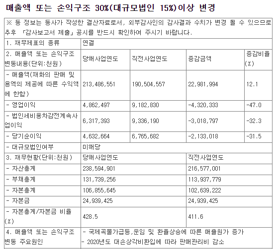 국제 곡물 가격 급등으로 고려산업의 매출은 오히려 영업이익이 -47% 감소하였습니다. 주요 원인으로는 운임 및 환율 상승에 따른 매출원가 증가로 파악되고 있습니다.