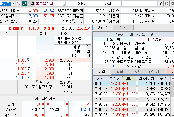 효성오앤비 일봉 차트를 보시면 전고가 18,000원 도달하고 지속적으로 하락세를 만들고 있는 와중에 오늘 큰 상승을 안 했지만 시간외단일가에 상한가 12,200원으로 마감을 하면서 내일 기대가 되는 종목 중 하나입니다.