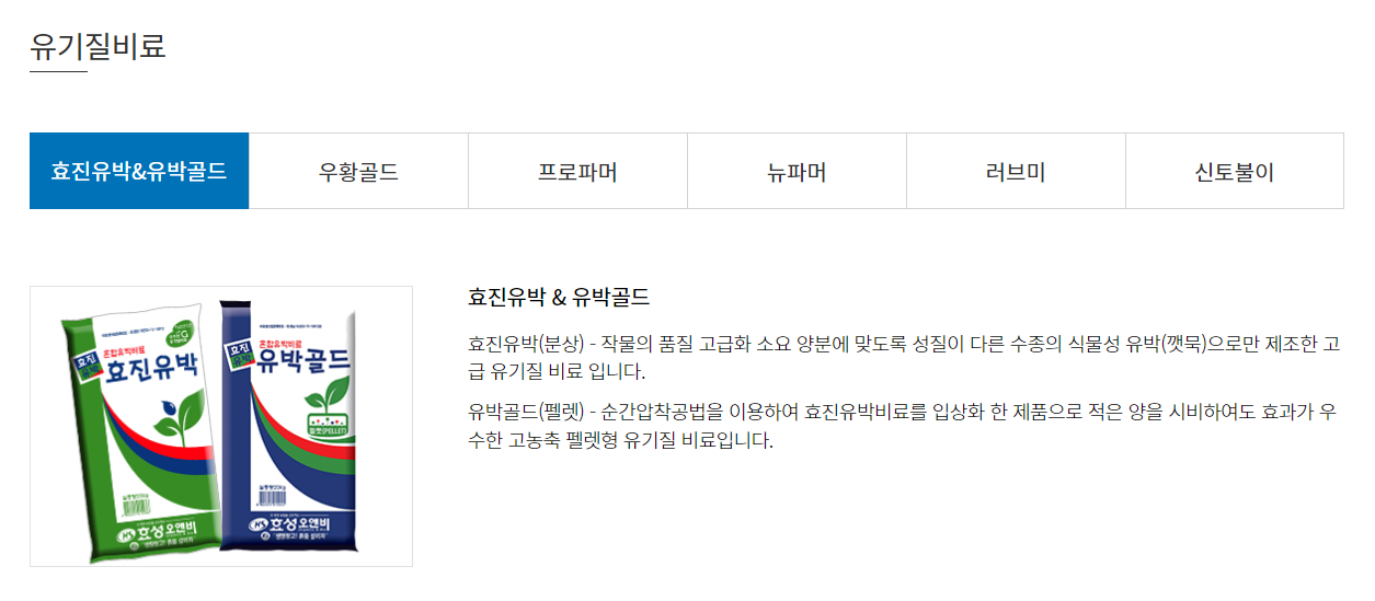 효성오앤비는 농협 계통 유기질 비료 납품 부분 선두 업체로, 주요 제품은 유기질비료인 혼합유박, 혼합유기질, 유기복합, 부숙 유기질, 기능성 바이오제품 등이 있습니다.