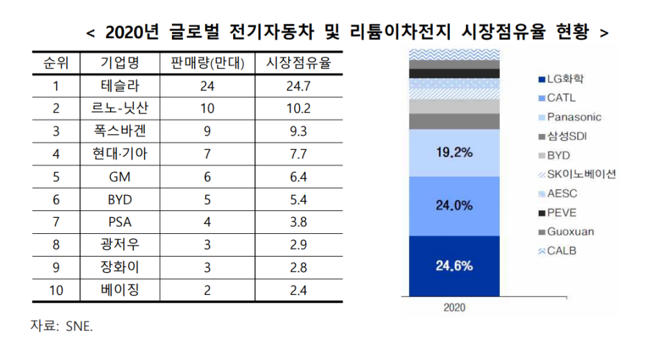 글로벌 전기자동차 시장에서 현대·기아 자동차도 4위권을 기록하고 있어 글로벌 수준의 경쟁력을 확보한 것으로 평가, 리튬이차전지의 글로벌 제 조사 중 LG화학이 1위 차지하고 있으며, 삼성SDI 4위, SK이노베이션 6위 수준입니다!!
