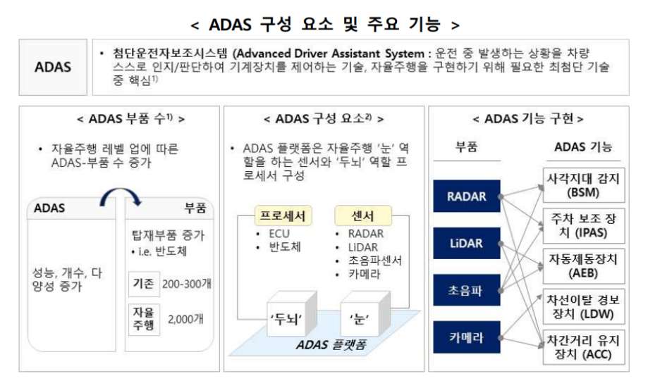 - 한국은 여전히 핵심 센서 등 중요 부품에 대한 기술확보가 더딘 상황이며, 인공지능 등 소프트웨어 경쟁력 확보도 시급합니다 ㅠㅠ