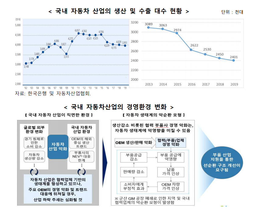 -국내 자동차 산업은 생산, 수출 및 내수 모두 침체인 상황이 2015년 이후 지속되고 있으며, 글로벌 자동차 시장환경도 빠르게 변화하고 있으며, 자동차 생산감소로 인해 관련 부품사의 경영 악화는 자동차 생태계 전반에 걸쳐 악영향을 미칠 우려가 커지고 있음^^