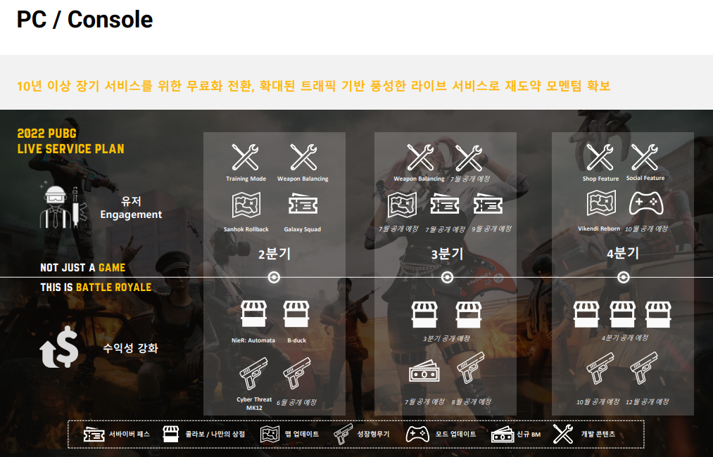 크래프톤은 배틀그라운드를 무료 플레이 서비스로 전환을 하면서 매출에 대한 뚜렷한 기대가 없다는 이유로 지독한 하락세를 보여주었습니다. 하지만 최근 크래프톤의 IR자료에 의하면 확대된 트래픽 기반 풍성한 라이브 서비스로 재도약 모멘텀을 확보하였다고 한다.