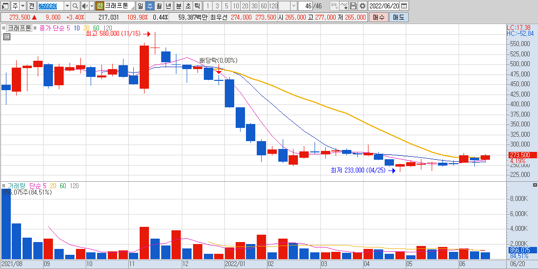 안녕하세요 벨카입니다. 상승 예상 종목으로 크래프톤의 분석을 해보려고 합니다. 사실 크래프톤은 상장 이후 지독한 하락세를 보여주고 현재는 바닥을 다지는 모습을 보여주고 있습니다. 주봉상 추세전환의 시도를 하려는 모습도 그렇고 하반기 매출에 대한 기대감 및 게임주들의 반등을 예상하는 시점에서 크래프톤을 분석을 해보려고 합니다.
