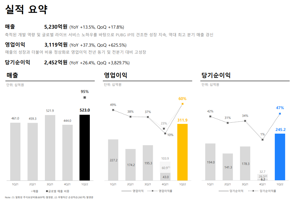 크래프톤의 실적을 요약하면 매출은 작년대비 13.5% 상승한 5,230억 원을 22년 1분기에 달성을 하였습니다. 영업이익 또한 3,119억으로 작년 대비 37.3% 상승을 하였고, 당기순이익 또한 26.4% 상승을 하였습니다. 전분기 대비로는 엄청난 성장을 한 모습을 보여주고 있습니다.