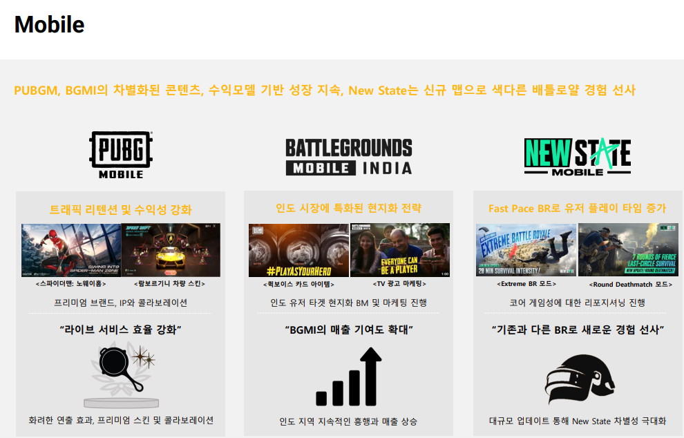 배틀그라운드 모바일 버젼은 화려한 연출 효과와 프리미엄 스킨 및 콜라보레이션을 통해서 라이브 서비스 효율 강화를 예상하고 있으며, 인도 지역 지속적인 흥행과 매출 상승으로 기여도 확대를 하고 있습니다. 뉴스테이는 대규모 업데이트를 통해서 차별성을 극대화하여 색다를 경험을 선사할 예정이라고 합니다.