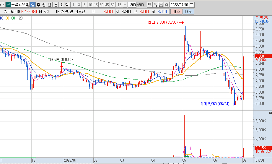다스코는 조정 후 다시 상승세의 모습을 보여주고 있으며, 7월1일 시간외상한가로 마감을 하면서 월요일도 기대가 되는 상황입니다. 시간외에 6,760원으로 마감을 하였습니다.