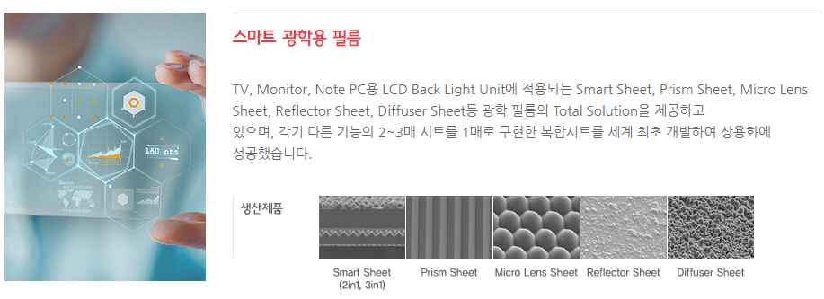 TV, Monitor, Note PC용 LCD Back Light Unit에 적용되는 Smart Sheet, Prism Sheet, Micro Lens Sheet, Reflector Sheet, Diffuser Sheet등 광학 필름의 Total Solution을 제공하고 있으며, 각기 다른 기능의 2~3매 시트를 1매로 구현한 복합시트를 세계 최초 개발하여 상용화에 성공했습니다.