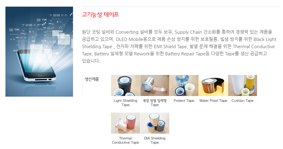 원단 코팅 설비와 Converting 설비를 모두 보유, Supply Chain 간소화를 통하여 경쟁력 있는 제품을 공급하고 있으며, OLED Mobile용으로 제품 손상 방지를 위한 보호필름, 빛샘 방지를 위한 Black Light Shielding Tape , 전자파 차폐를 위한 EMI Shield Tape, 발열 문제 해결을 위한 Thermal Conductive Tape, Battery 일체형 모델 Rework을 위한 Battery Repair Tape등 다양한 Tape를 생산 공급하고 있습니다.