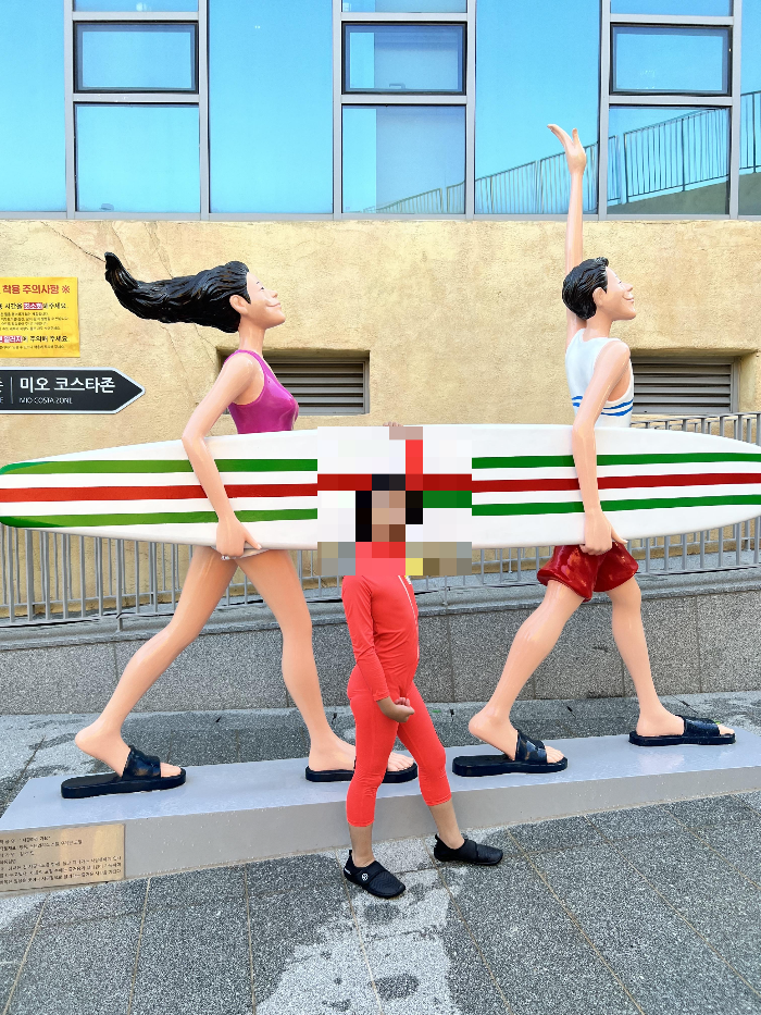 미오코스타존 입장 전 딸이 뒤에 동상에 포즈에 맞춰서 사진을 찍었습니다.