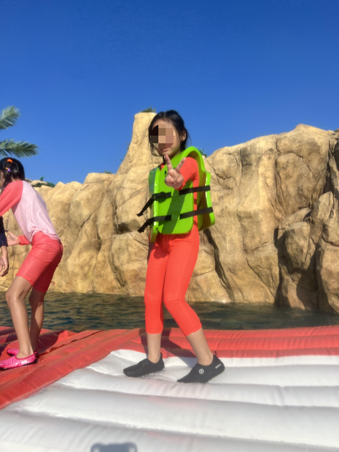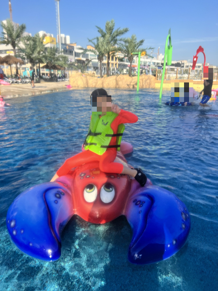 아이들이 놀기 좋게 캐릭터 튜브도 있고, 물 위에서 중심 잡으면서 뛰어다닐 수 있는 곳도 있어서 아이들이 정말 좋아했습니다.