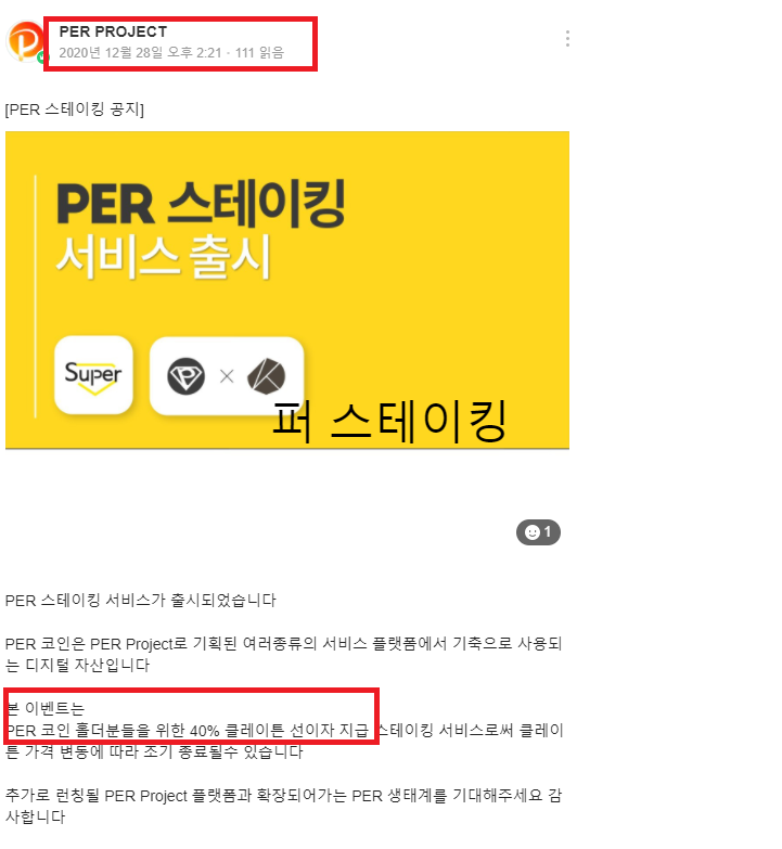 퍼 스테이킹 서비스 오픈 공지가 뜨면서 내용이 공개되었네용.