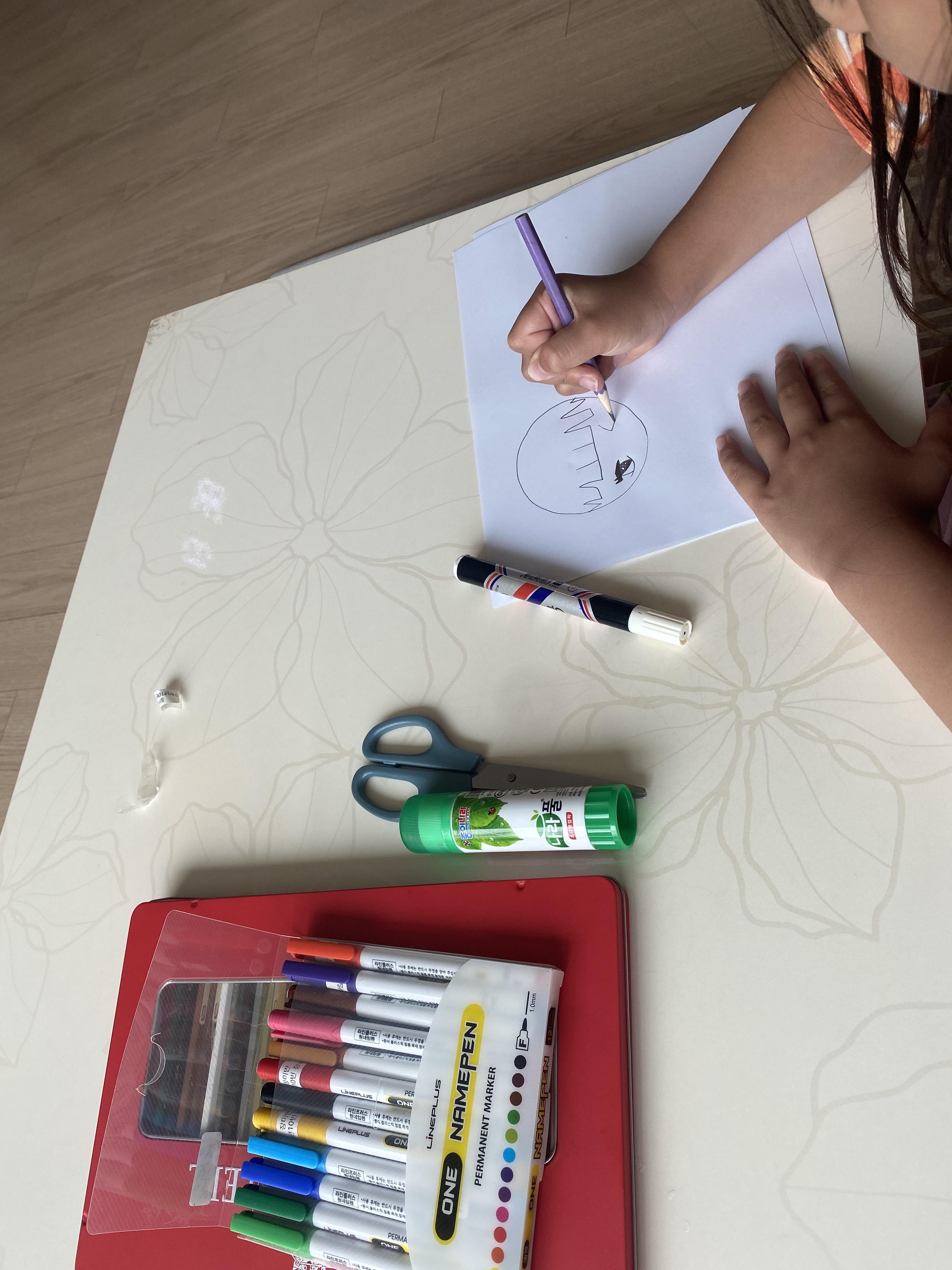 아이랑 함께 준비물을 준비하고 종이위에 그리고 싶은 것을 그리게 합니다. 먼저 스톱모션이 어떻게 하는 건지 설명을 해주고 그리라고 해야 아이도 이해하고 그립니다.
