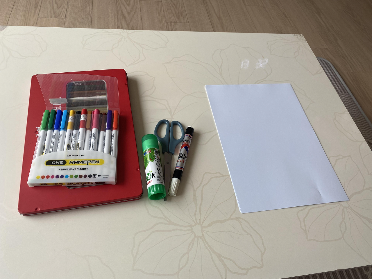 가위, 풀, 매직, 종이, 네임펜, 색연필 등