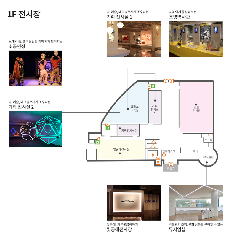 1층 조명 박물관은 소공연장, 기획 전시실, 조명 역사관, 빛공해 전시장, 뮤지엄샵이 위치해 있습니다.
