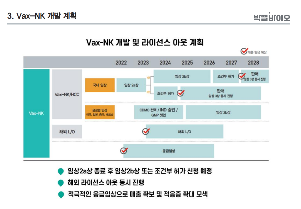 박셀바이오의 주요 상승 사유인 Vax-NK 개발 계획으로는 2023년 임상 2a상을 종료 후 조건부 허가 또는 임상 2b상을 준비하고 있습니다. 박셀바이오 IR자료에 의하면 매출 발생예상 시점을 조건부 허가 승인을 마친후 발생할 것으로 예상을 하고 있습니다. 또한 해외 라이선스 아웃 동시 진행 및 적극적인 응급인상으로 매출을 확보할 예정이라고 합니다.