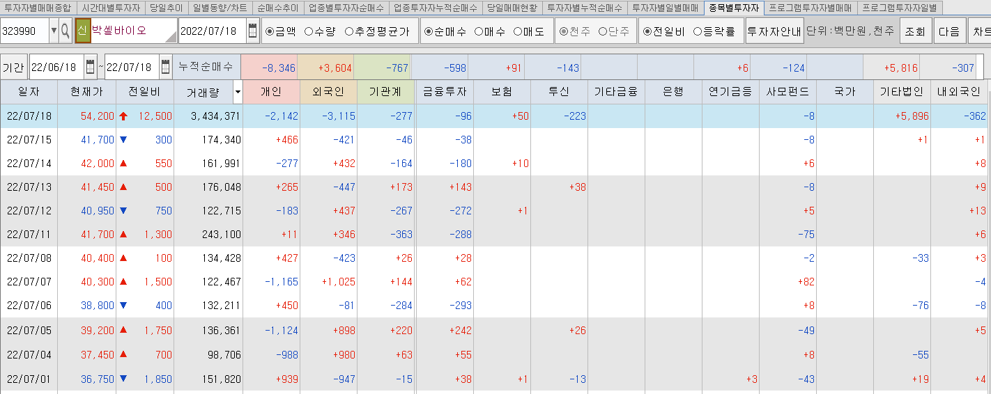박셀바이오가 상한가를 마감한 7/18 수급을 보면 개인, 외국인, 기관계, 금융투자가 매도세를 보여주고 기타법인에서 매수를 하는 수급을 보여주었습니다.