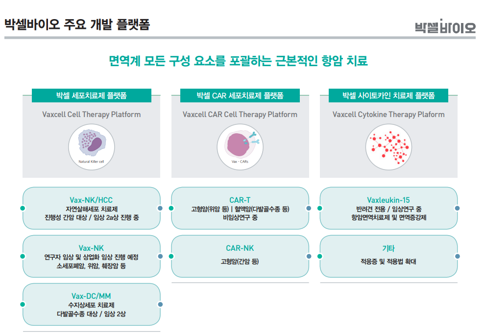 주요 박셀 세포치료제 플랫폼으로 간암 자연살해세포 치료제 말고도 소세포폐암, 위암, 췌장암, 다발골수종 대상 등에 쓰이는 치료제를 개발하고 있습니다. CAR 세포치료제, 사이토카인 치료제 등도 근본적인 항암치료 개발 플랫폼을 가지고 있습니다.