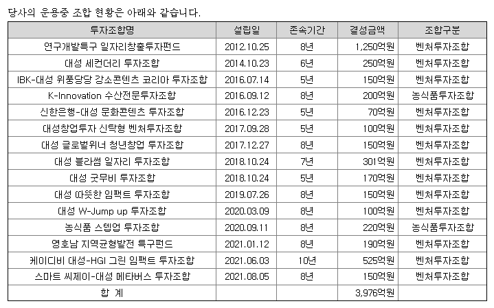 대성창투 주요 수익구분은 위 사진과 같이 투자조합수익에서 대부분을 차지하고 있으며, 운영 중인 조합 현황은 여러 개가 있습니다.